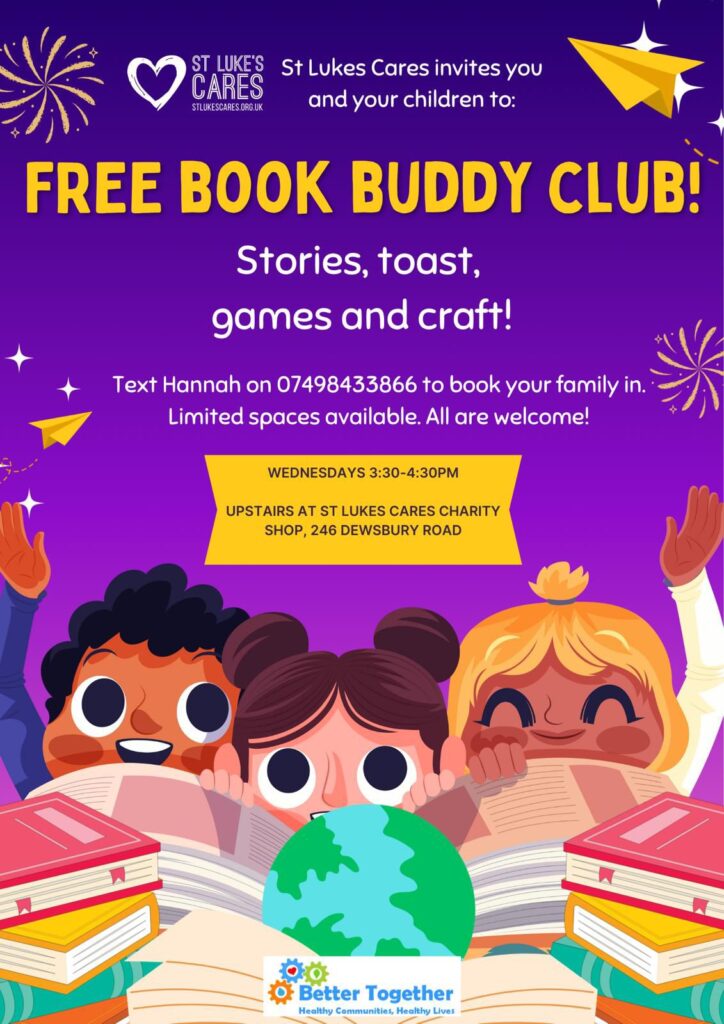 We’re excited to let you know that we’ve started a weekly Book Buddies Reading Group upstairs at the charity shop. It happens every Wednesday 3:30-4:30, no need to book just turn up! This is a group for families to come to, sit down, have a cuppa and some snacks and spend some time reading our excellent selection of books in a warm welcoming environment. All are welcome, we’d love to have you along. For more info please contact hannah@stlukescares.org.uk